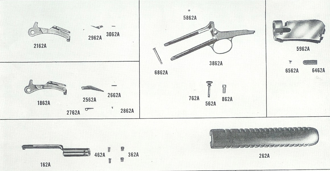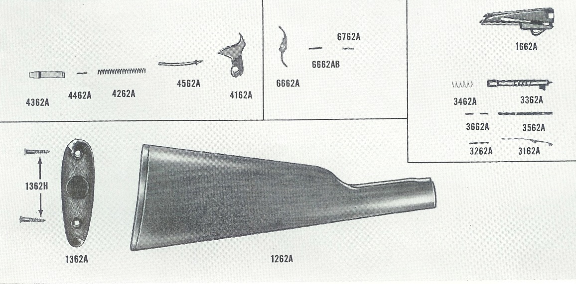 The family of models 1890, 90, 06, 62 and 62A will use many parts interchangeably, with the listings shown below. Most of the action parts are the same except the 62A which uses a coil type mainspring. The 1890 is just a earlier version of the model 90, these two had both round and octagon 24" barrels, curved steel butt plates, with special order 1/2 PG butt stocks. The 1890 and 90 could be had in either 22 Short, 22 long or 22 WRF.
