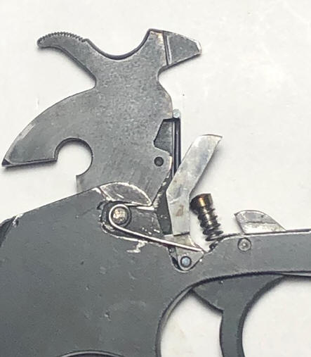 | Here you see the relationship of the hand and it's spring, along with the top of the old syle trigger spring & plunger just forward of it, then the cylinder stop on the far right |