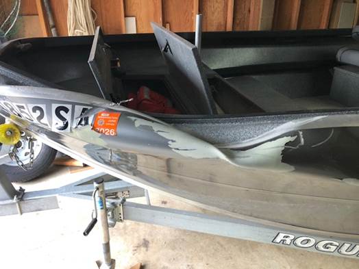 | Below you can see the DEEP scratch marks on the Port gunnel where the other boat’s chine/keel drug (about the middle of the seat to rearward in the foreground), along with the caved in Port gunnel of the initial hit |